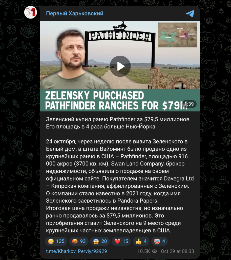 Проросійський телеграм-канал «Первый Харьковский» опублікував відео й текст: нібито президент України Володимир Зеленський «купил ранчо Pathfinder за $79,5 миллионов. Его площадь в 4 раза больше Нью-Йорка».