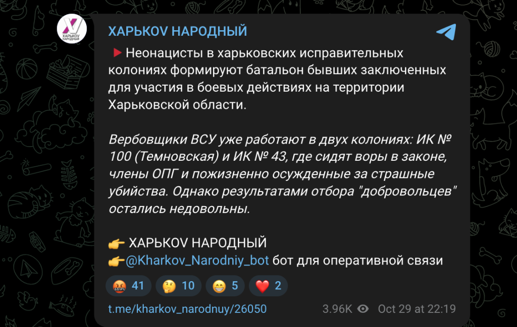 Телеграм-канал «ХАРЬКОV НАРОДНЫЙ» заявляє, що у двох колоніях на території Харківської області Збройні сили України вербують колишніх в’язнів для служби в ЗСУ.
