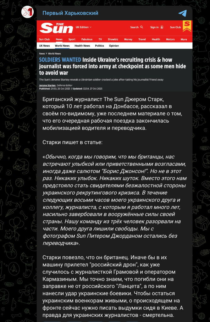 «Первый Харьковский», російський телеграм-канал, орієнтований на жителів тимчасово окупованих територій, опублікував новину з посиланням на видання The Sun. Там нібито приведено цитату британського журналіста Джерома Старкі про те, як мобілізували його перекладача.