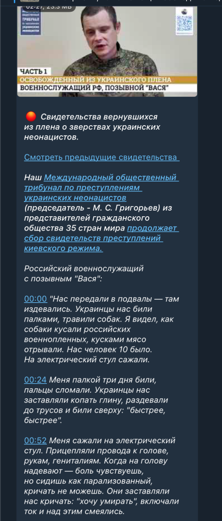 Російський телеграм-канал «РУССКИЙ Z ХАРЬКОВ V» перепостив новину іншого каналу «VОZМЕЗДИЕ». У ній чоловік, якого нібито звільнили з українського полону, розповідає про звірства, які йому начебто довелося пережити, та як жорстоко до нього ставились українці.