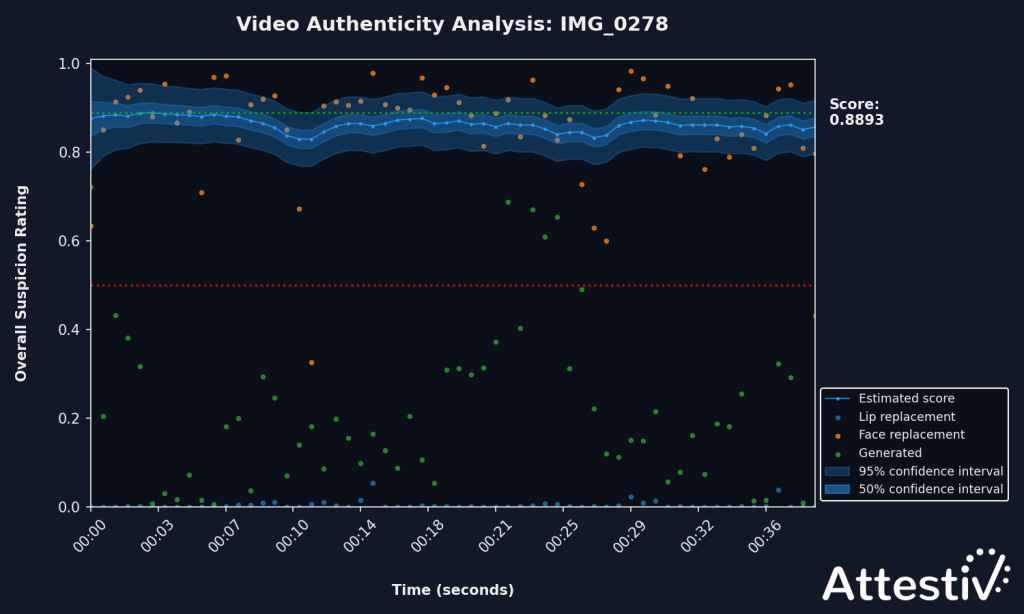 Що відео фейкове, підтверджує аналіз, проведений за допомогою сервісу Аttestiv. За його даними, майже щосекунди ролику застосовується технологія заміни обличчя. Аttestiv присвоїв «Стефанчуку» рейтинг 88: за градацією сервісу — «дуже підозрілий контент».
