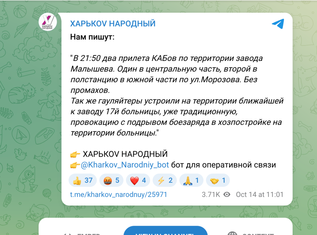 Насправді 13 жовтня о 21:50 російська армія атакувала лікарню в Салтівському районі Харкова керованими авіаційними бомбами. КАБ зруйнувала гаражні бокси, пошкодила 19 автомобілів, вибила вікна та двері в корпусі лікарні. 51 пацієнт отримав гостру реакцію на стрес, шестеро — поранення від уламків скла. Усіх евакуювали та перевели до іншого медзакладу.