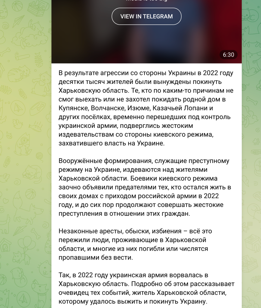 Канал окупантів «Первый Харьковский» обрав цікаву стратегію пропаганди: вони беруть реальні злочини росії та замінюють назву своєї держави на Україну. Нібито саме українська армія в 2022 році «увірвалася» до Харківської області та скоювала злочини проти мирного населення.