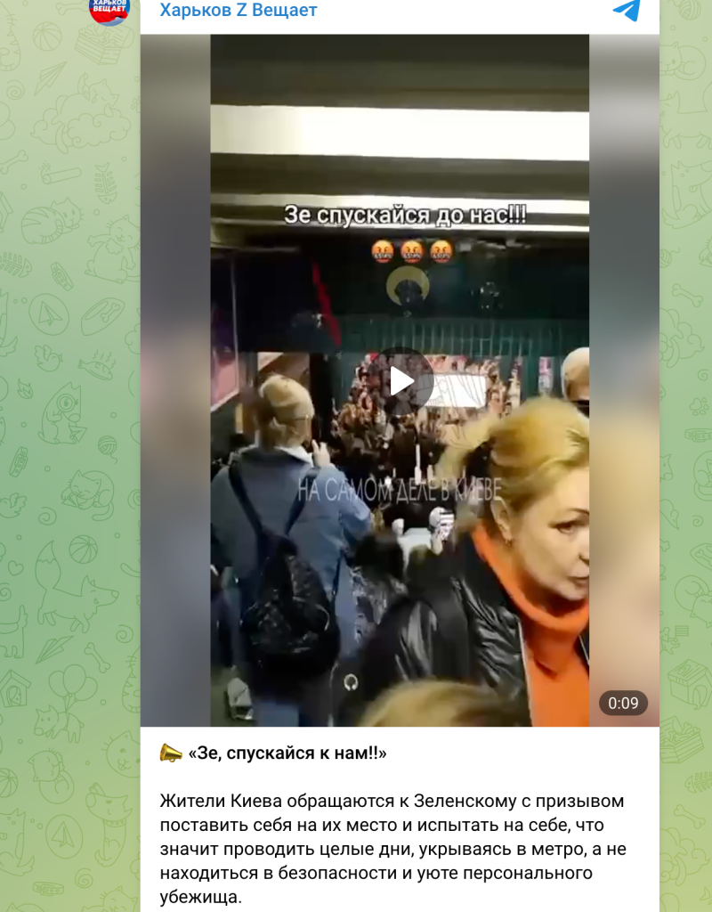 Медійники окупантів з пабліку «РУССКИЙ Z ХАРЬКОВ V» опублікували відео, що «кияни під час повітряної тривоги ховаються в метро й вигукують: “Зеленський, спускайся до нас!”».