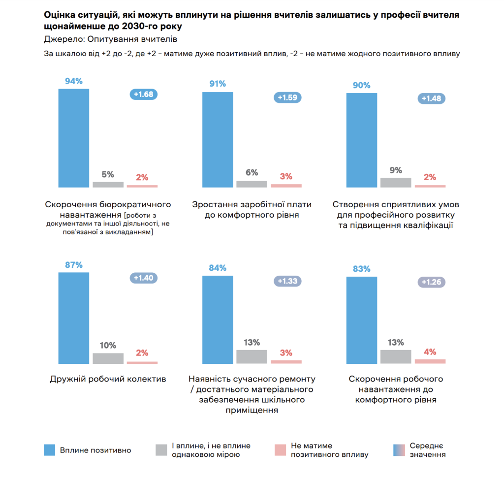 У торішньому дослідженні медіа «Освіторія» прогнозувало, що 40% вчителів можуть піти з професії до 2030 року. Лише 47% опитаних були задоволені роботою, 20% — рівнем цінування їхньої праці в суспільстві і тільки 12% — рівнем зарплати. Найважливішим фактором, який може втримати педагогів на роботі, респонденти вказали скорочення бюрократичного навантаження (94%) , на другому місці — підвищення зарплати (91%).