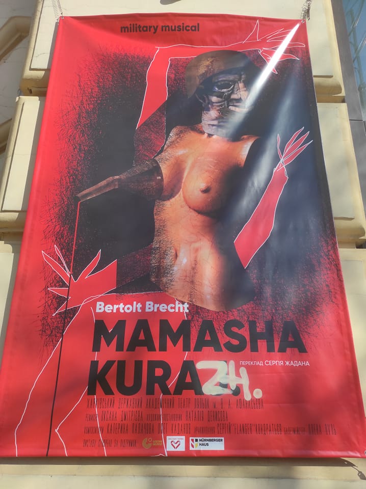 У 2021 році ми повернулися до цієї п’єси вже з іншими питаннями. Завдяки перекладу Жадана текст став ще гострішим. Це була розмова з нами самими — людьми, які живуть у просторі війни, але часто її не помічають. Вистава мала бути дуже чесною і дуже болісною. Її прем’єра була призначена на 24 лютого — хіба не сюрреалістично це звучить тепер? Усі пам’ятають плакат, де Аня Брагіна інтуїтивно закреслила кілька літер у слові «Кураж» і замінила їх на «Z». Тоді в порожньому Харкові він висів на фасаді театру, і волосся ставало дибки.
