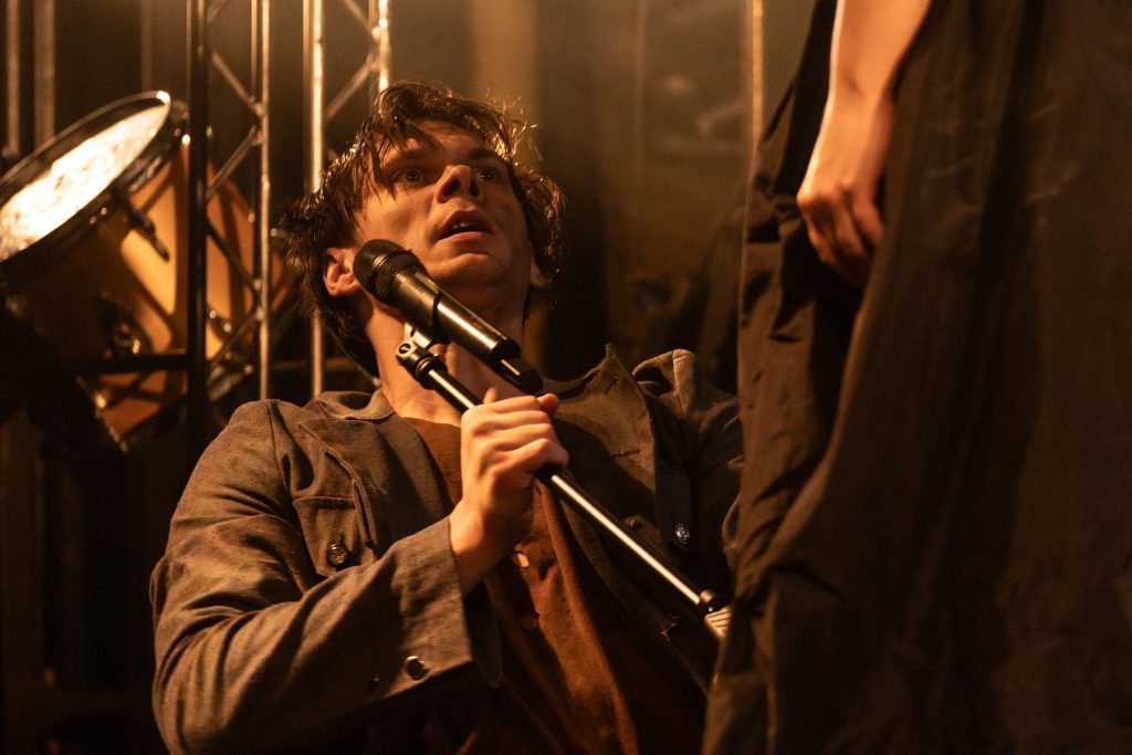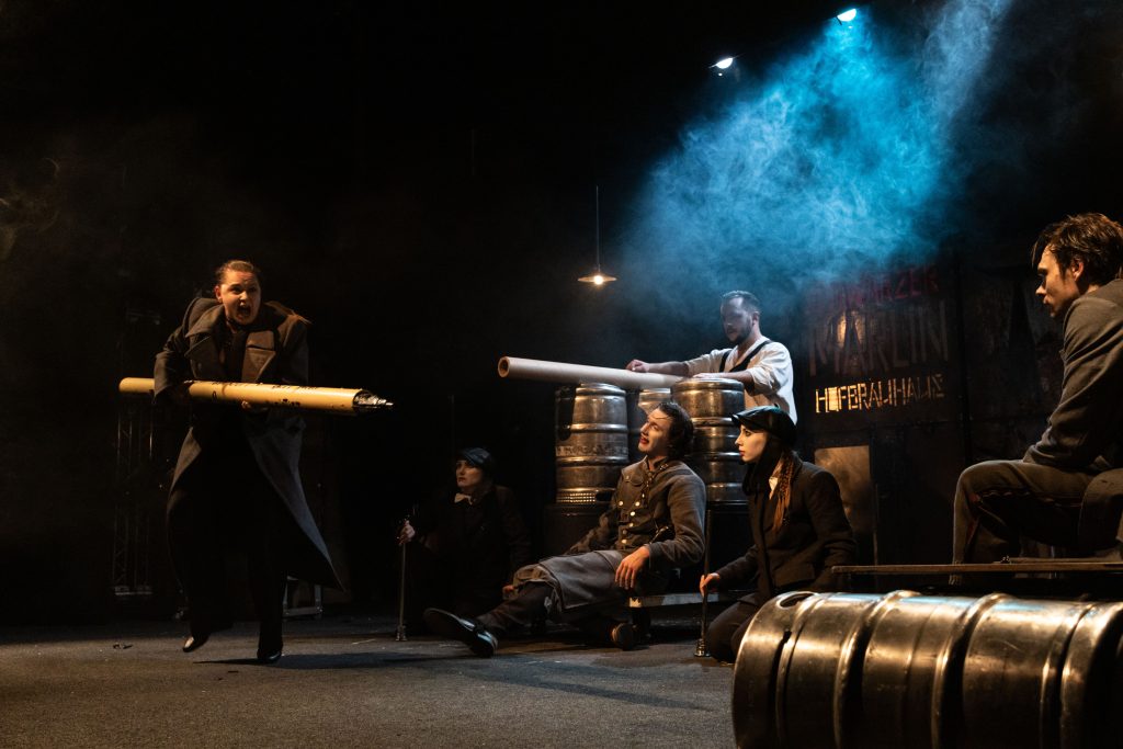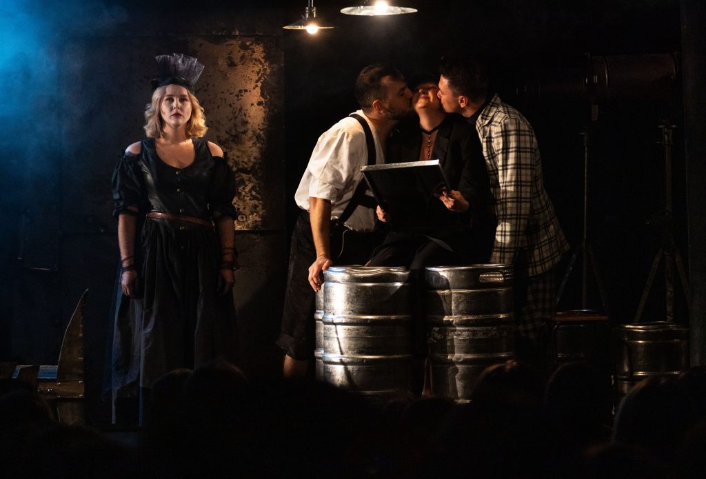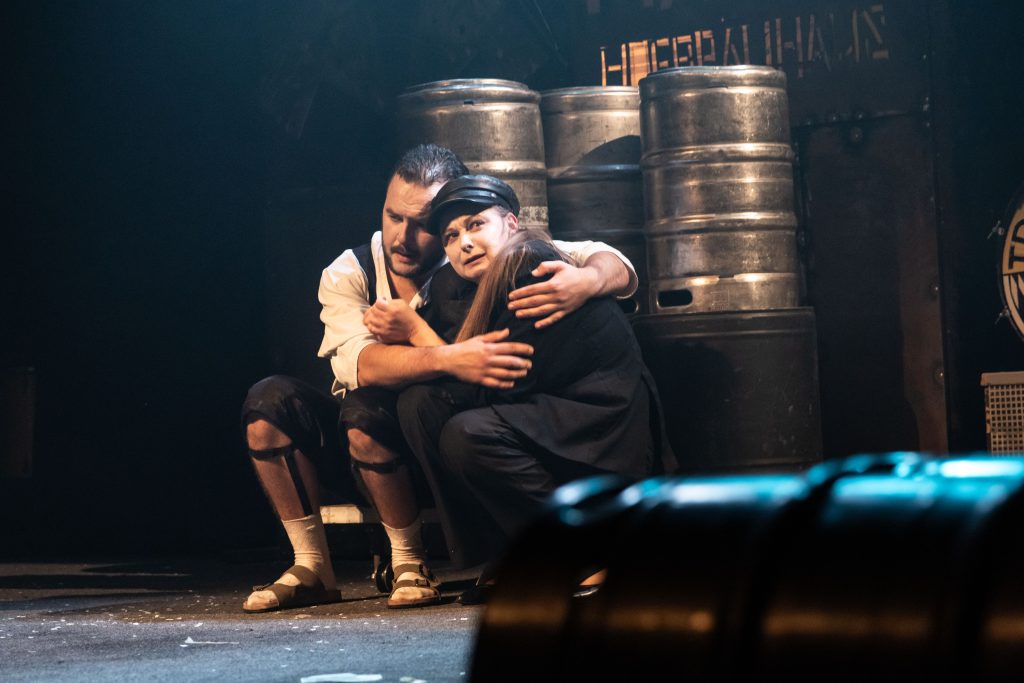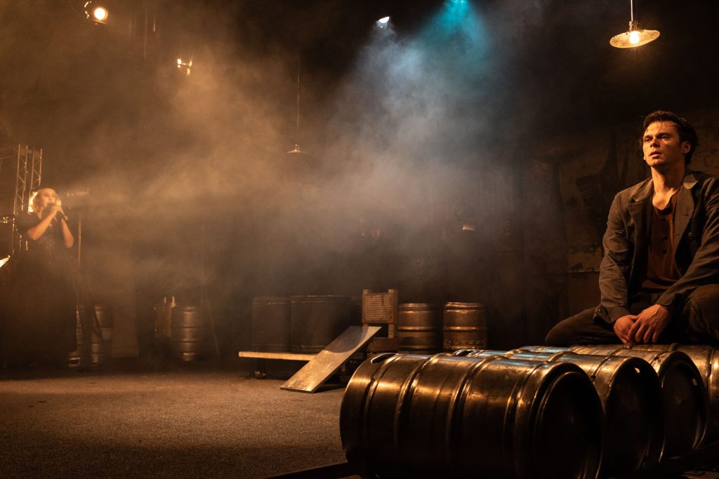 Притлумлене, припилене світло, холодні кольори. Атмосфера чи то товарного потягу чи то підвалу. Дим, жестяні діжки, металеві «гострі» декорації. Простір кабаре, що легко можна сплутати з камерою-одиначкою чи потойбіччям.