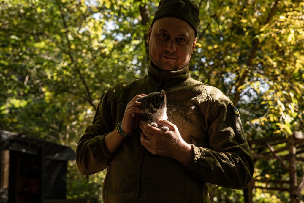Ми пакуємо фототехніку в наплічники, перевіряємо зброю, БК і чекаємо сигналу на повернення в тил. Вирушимо, коли буде «вікно» у небі. Повз нас продзижчав ворожий дрон, а трохи далі по ньому затуркотів кулемет мобільної вогневої групи. Кулеметну чергу перериває вибух і радісні вигуки: збили! Ці звуки тут абсолютно буденні. Артилерійське кошеня не лякається: сидить на руках у бійця, муркоче й уважно дивиться на нас блакитними очима.