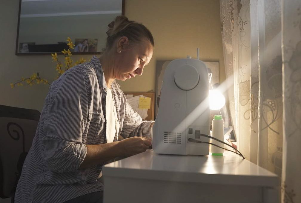 Ми вдома в однієї з волонтерок харківського осередку «Швейної роти» Анни Вербицької. До вторгнення вона працювала в дитсадочку в центрі Харкова. Анна шиє адаптивні труси зі світлої тканини, на якій веселий мультовий принт.